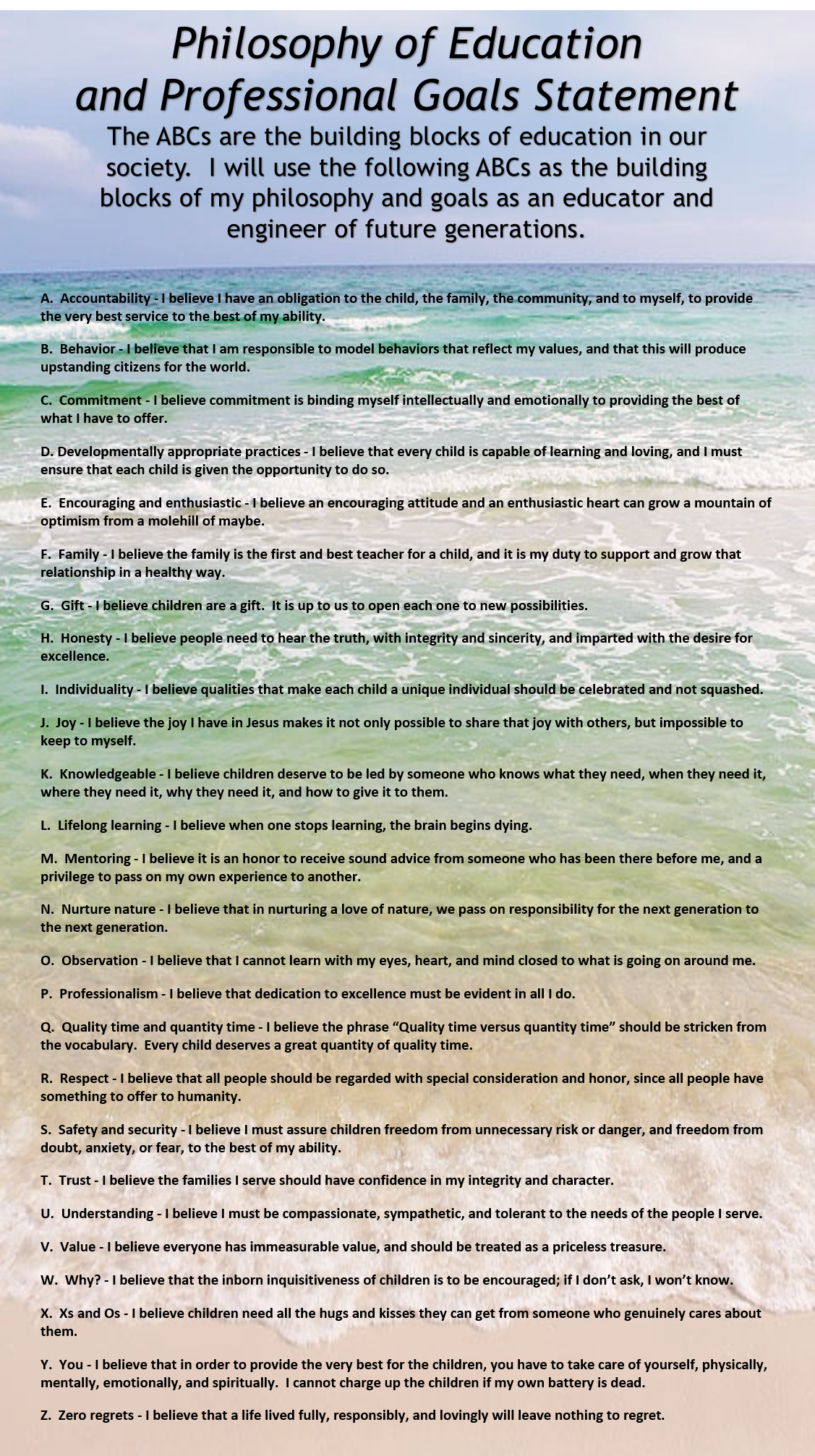 My philosophy of early childhood education actually parallels my life beliefs very closely. I am sharing my own project, and I encourage you to try this for yourself. Think about those ideals, habits, objects, and relationships that are most important to you and that define who you are. Then, see if you are living your beliefs out in your life.