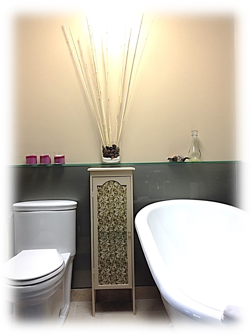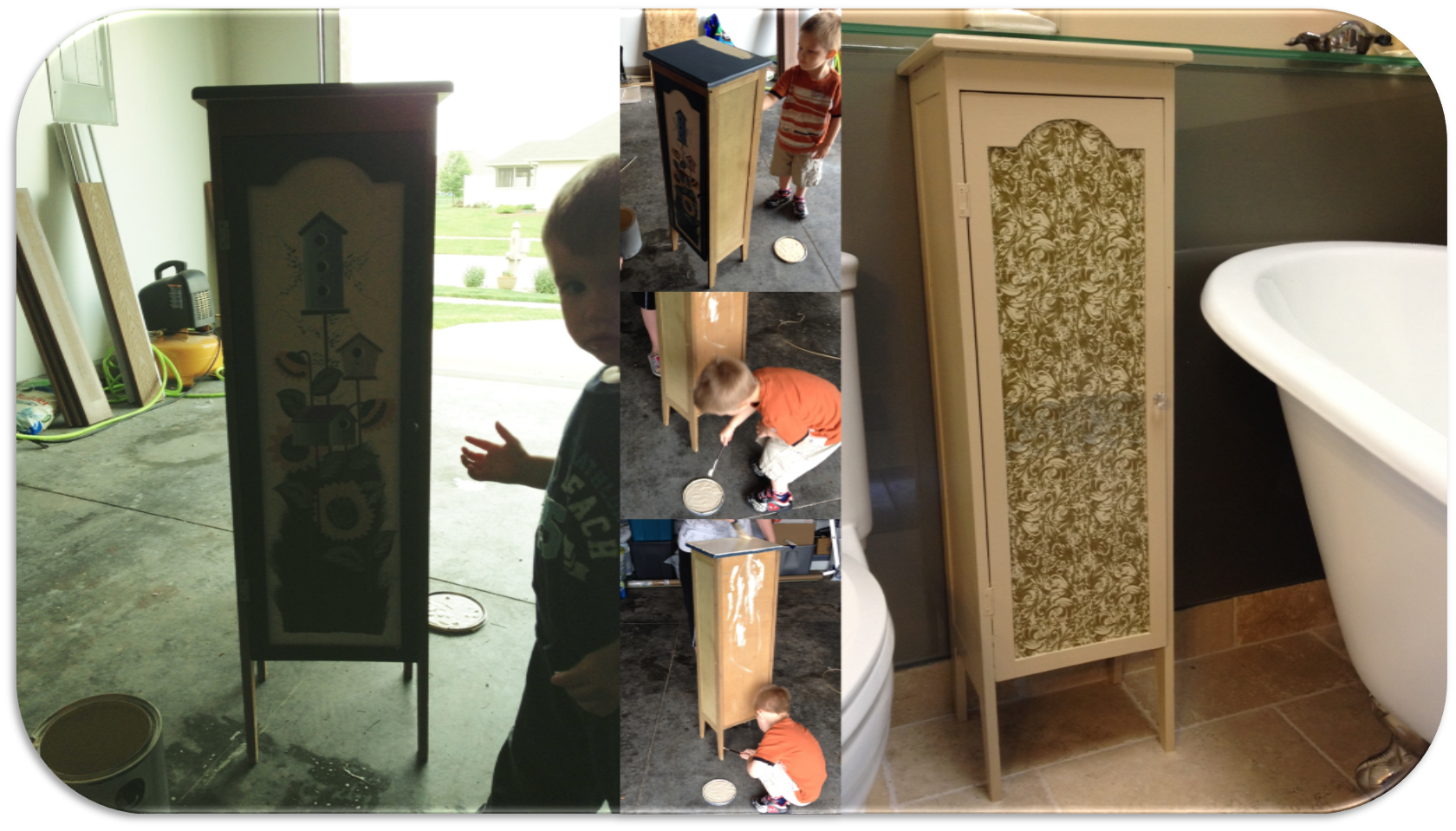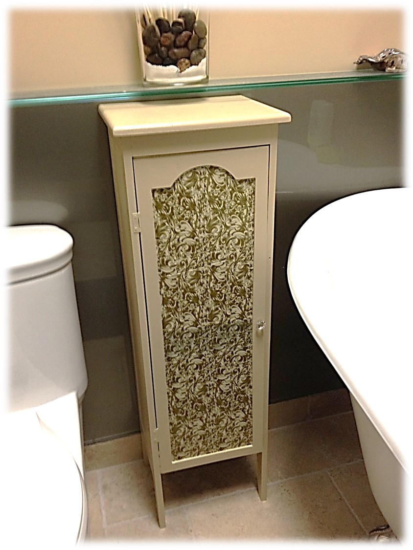 Two of my grandsons helped me paint it. I then mod-podged the gold-patterned tissue paper to the panel on the door. I removed one of the two shelves inside to accommodate a plunger and toilet brush, leaving the top shelf to hold extra toilet paper. Practical, convenient, and beautiful!