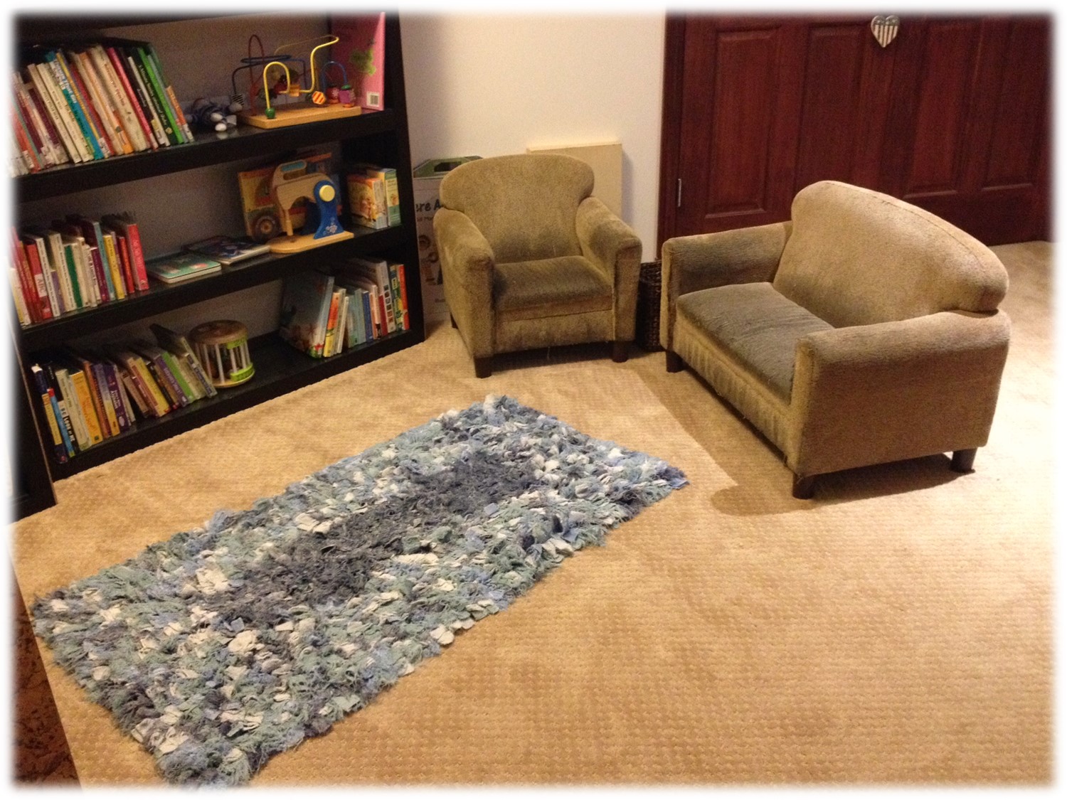 These furniture pieces are child-sized and were being thrown away by a childcare center. They will be perfect after being reupholstered! The rug on the floor is made from tattered towels cut into strips and sewn onto a not-so-tattered towel. Comfy and completely washable.