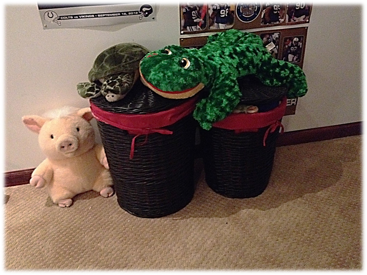 These wicker baskets still had the liners! I put the liners through the wash, and scrubbed the baskets and lids. Perfect storage for my dozens and dozens of stuffed animals.